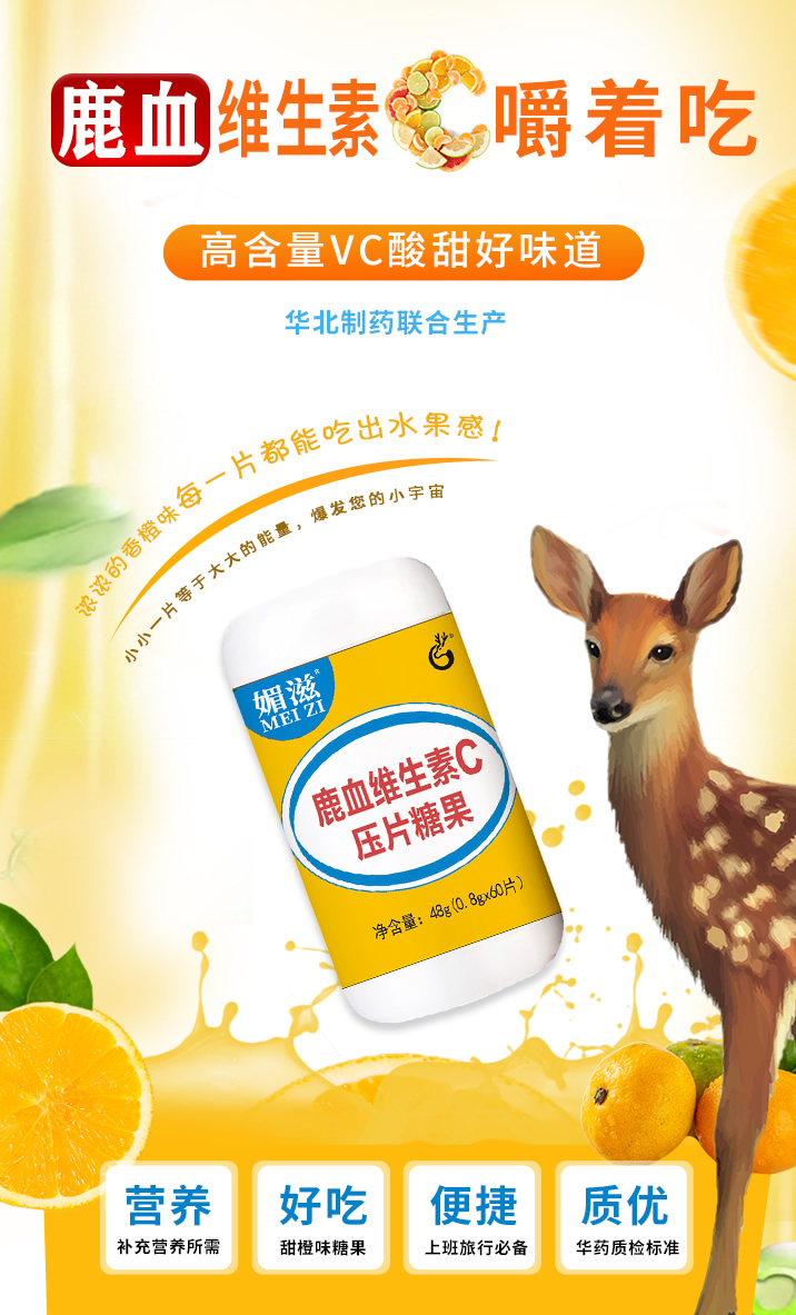 【配料表】山梨糖醇、鹿血凍干粉(1%)、維生素 C 、檸檬酸、阿斯巴甜(含苯丙氨酸)、硬脂酸鎂、食品用香精、日落黃鋁色淀